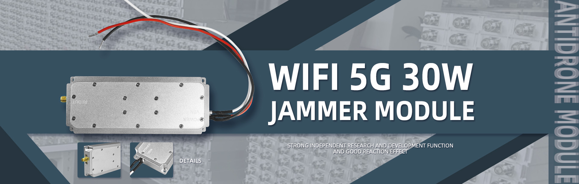 Дронға арналған 300 МГц 30 Вт анти дрон сигналын бөгейтін құрылғы модулі - бұл ақпараттық қауіпсіздік модулі, ол ұшқышсыз жерүсті станциясының сигнал беруін блоктау үшін арнайы әзірленген. Бұл модульдің орташа шығыс қуаты 45 дБм (30 Вт), жеткілікті қуат, диапазонның тегістігі жақсы, шағын офсет жоғарғы және төменгі бүйірлік жолақ арасында, жоғары тиімді сыпыру кедергі көзі шағын температура ауытқуы бар. Оны қолдану оңай және жиілікті секіргіш дрон үшін жақсы қарсы әрекет.